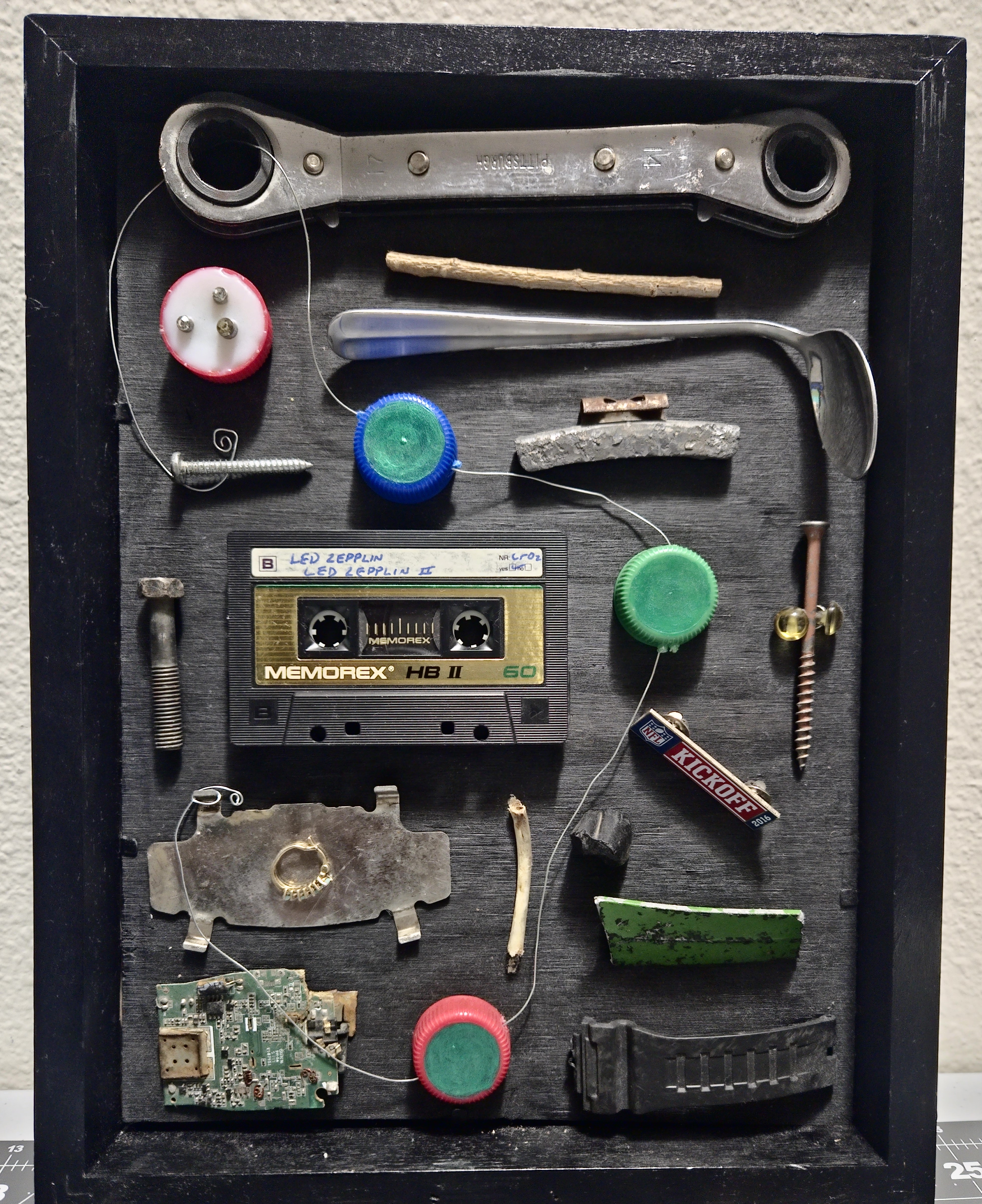 This is one of my mixed media collages and it’s 11 x 14 inches. I like using upcycled items, like old paperwork. $110