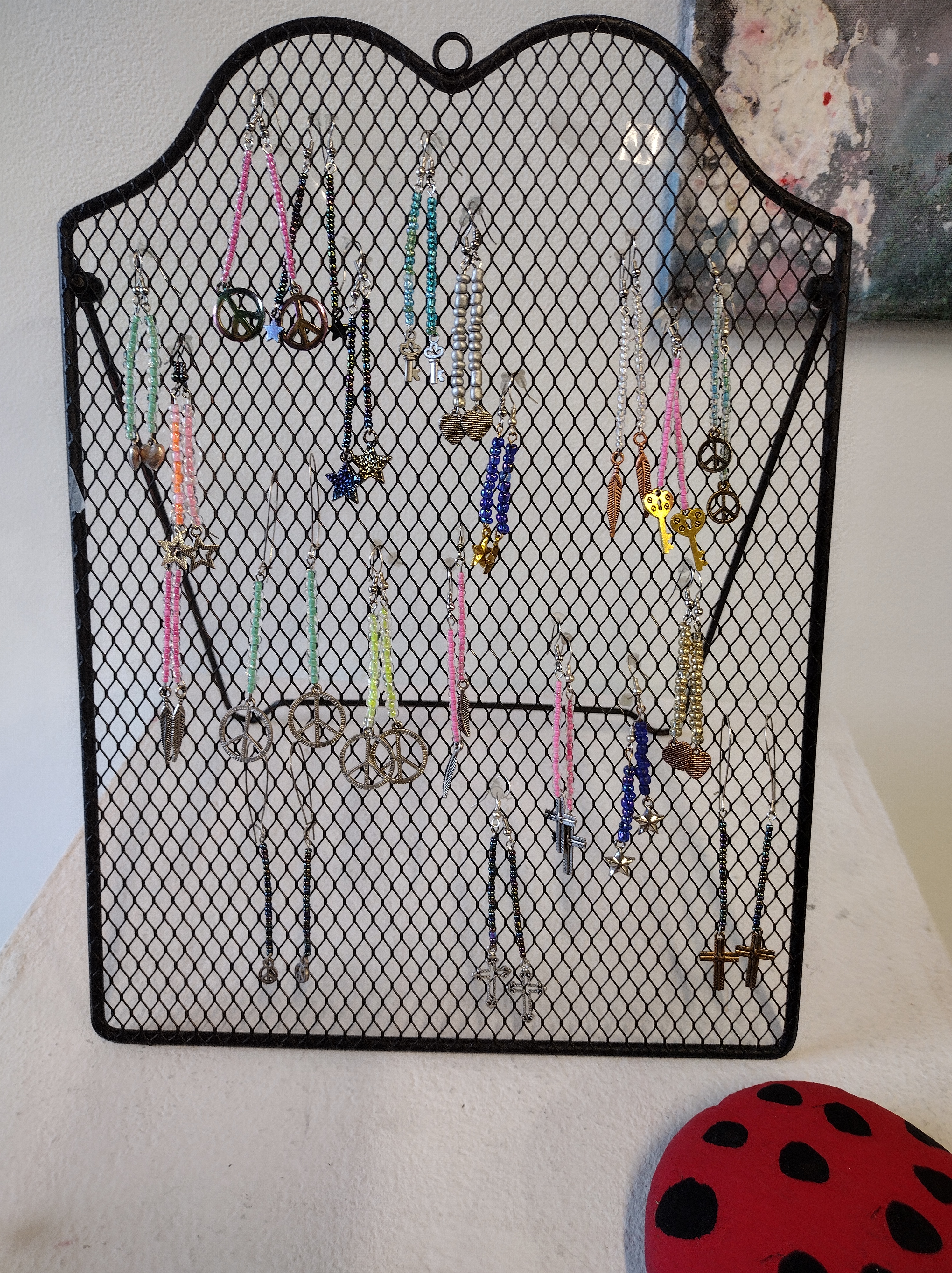 I repurpose a lot of clothes. I prefer making long-lasting items like tote bags, pouches, and other accessories. I have used my dad’s old clothes to repurpose a skirt, art tapestry, and purse. I made earrings, book covers, and much more. I like to use old mail to paint and collage with.